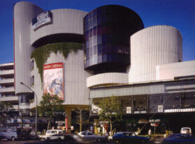 The first commercial building by Mori Building. It adopted a skip-floor structure to reconcile the site's elevation differences, three-dimensionally incorporating the dense cluster of quirky small shops characteristic of Harajuku's streets into the building. Through the skip-floor design, stores are arranged along spiral staircases and street-like spaces, creating an engaging shopping experience where visitors can enjoy moving through the building. The facade, designed to represent Harajuku's streetscape of diverse storefronts, features a combination of concrete and glass curtain walls formed into varying-sized cylindrical shapes. The technique of integrating site elevation differences into the building's design was later inherited by Omotesando Hills.